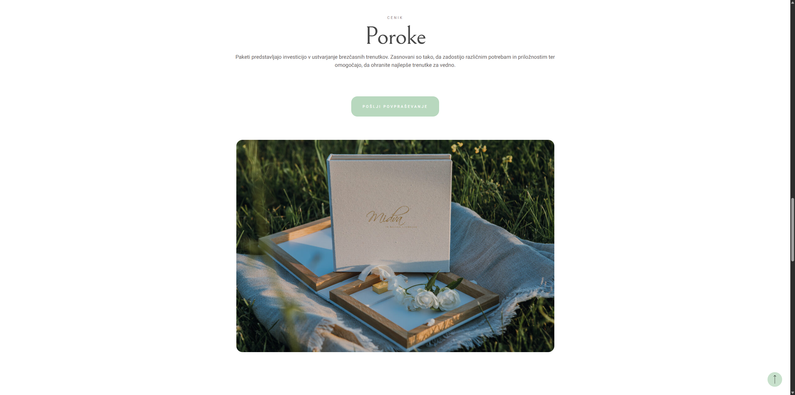 Vsebine so razdeljene v tematske galerije, ki prikazujejo intimne trenutke družin in nepozabne spomine z porok. Poleg vizualne predstavitve je stran zasnovana pregledno in uporabniku prijazno, z možnostjo hitrega dostopa do kontaktnega obrazca za povpraševanje.
